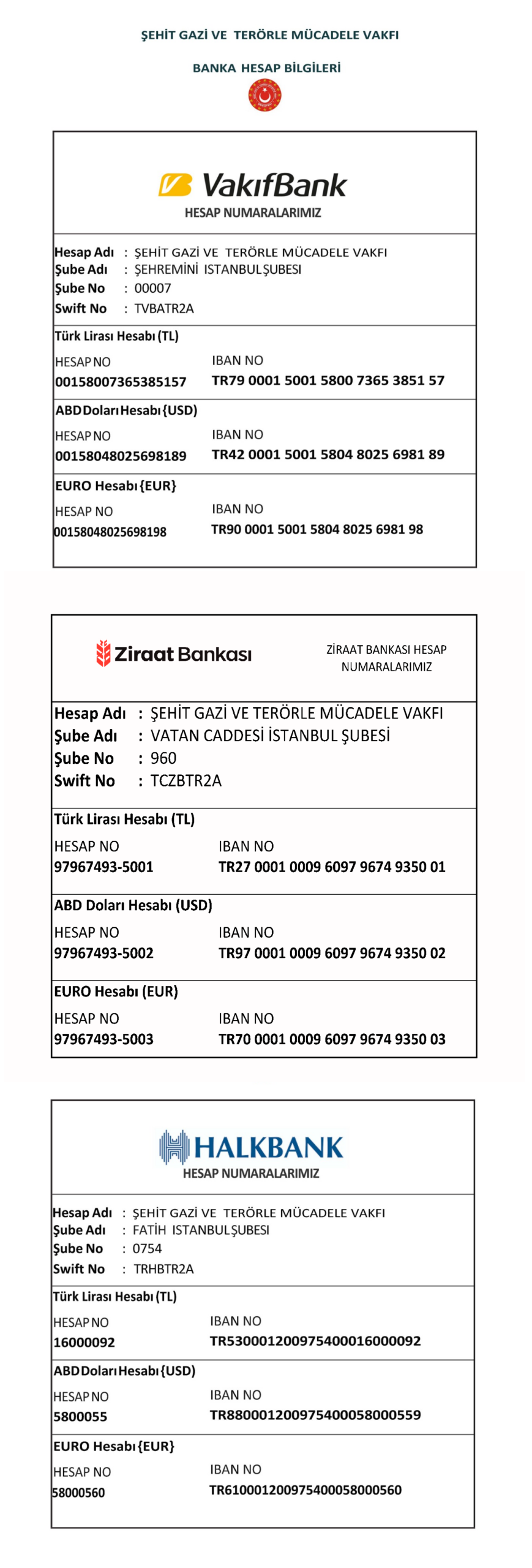 ŞEHİT & GAZİ Devletin, Milletin Onuru, Şerefi ve İtibarıdır. TANITIM FİLMİ İSTİKLAL MARŞI FAALİYETLER Faaliyetler, Haberler By: ŞEGATEM, Kuzey Marmara Otoyolu’nda meydana gelen kazada Şehit olan polis memurumuz Seçkin YALÇIN için düzenlenen cenaze törenine katıldık Ziyaretler By: ŞEGATEM, Adalet Bakan Yardımcısı Sayın Abdullah AYDOĞDU’ya hayırlı olsun ziyareti Faaliyetler, Haberler By: ŞEGATEM, Vakfımızın Romanya Temsilciliği görevine Sayın Necati Alçık atanmış olup, kendisine mazbatası takdim edilmiştir. Tüm Faaliyetler VAKIF ÇALIŞMALARI VAKIF OLARAK DEVAM EDEN FAALİYETLERİMİZİ İNCELEYEBİLİR, ONLİNE OLARAK DESTEK OLABİLİRSİNİZ. Aile Desteği Eğitim Desteği Sağlık Desteği Facebook Instagram Youtube Twitter ŞEHİT GAZİ VE TERÖRLE MÜCADELE VAKFI BANKA HESAP BİLGİLERİ